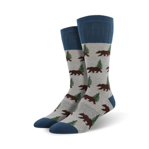 Catch a trout with your thoughts while you chill in your living room with these "Outland Bear" socks. The socks are gray with a fun pattern of brown bears standing on their back legs and facing your eager eyes, and green pine trees. They are adorned with blue toes and heels! Get these boot socks today and wear a piece of the great outdoors in every step you take.