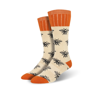 **Outlands Bee Socks**: Buzz around in style with our quirky bee socks! These cream-colored socks feature a pattern of black bees with orange wings and a matching orange band at the top. Show off your love for nature and stand out in the bee-st fashion. Perfect for the nature lover or quirky sock enthusiast who wants to add a touch of fun to their wardrobe. Step out in these buzzin' beauties and let your personality shine.
