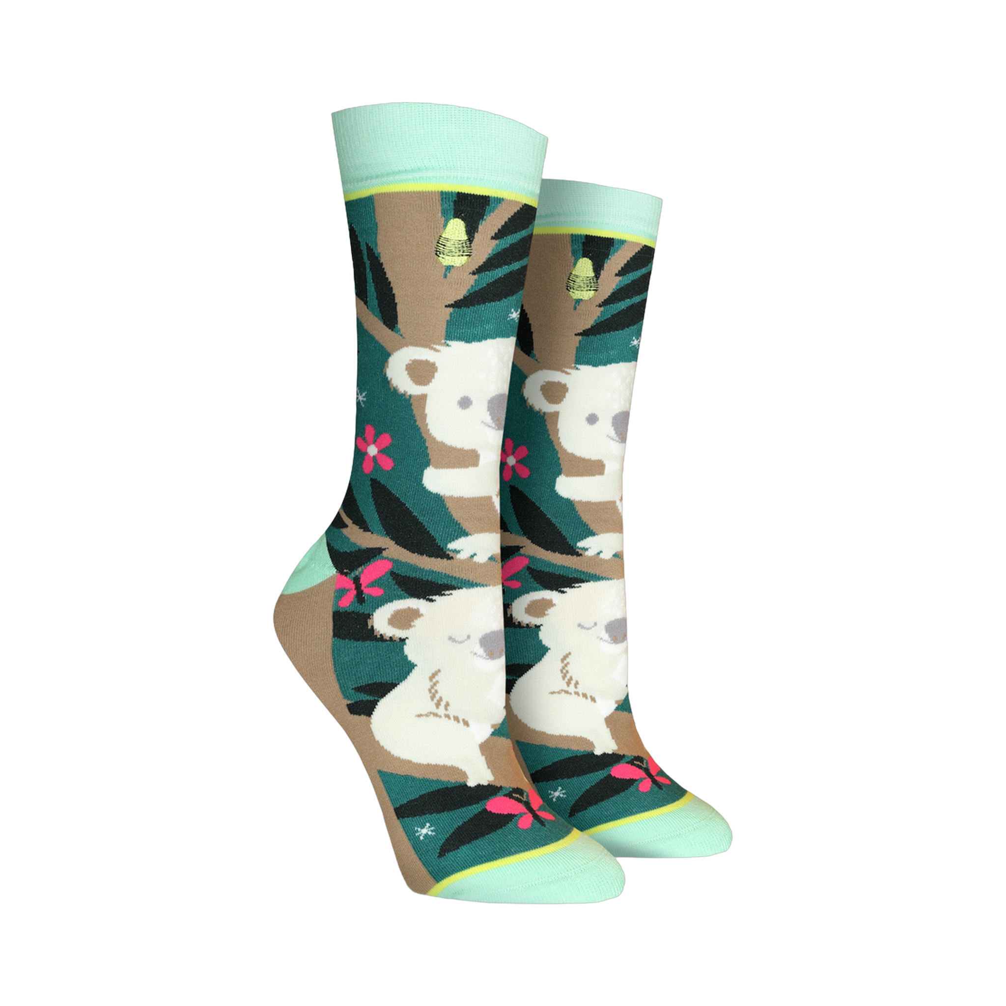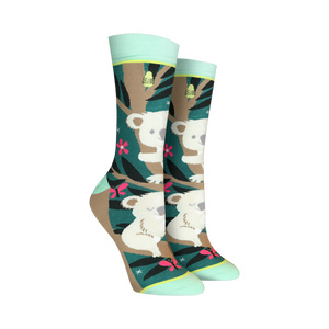 Hop on over to koala-ty style with these Over Koala Fied socks! Picture this: you're lounging in these green, brown, and light blue socks with its fun pattern of koalas, flowers, and leaves. Top it off with the "Over Koala Fied" stitched on top, and you've got yourself a recipe for a good time. Who wouldn't want to wear a reminder that even the cutest of creatures can be resilient? Whether you're a koala-lover or just looking for a fun pair of socks, these are the perfect pick!