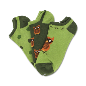 Owl-some Accessories: Step into a fantastical forest with these quirky ankle socks for women, showcasing cartoon owls wearing glasses. One sock flaunts polka dots and the others feature a large owl with branches or a trio of wise owls perched on a branch. Embrace the charm of these dark forest green socks and let your feet experience the magic of these vibrant birds of wisdom!