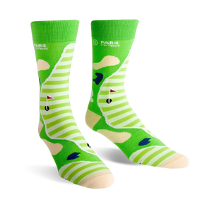 Fore! Sink your toes into the Par 4 novelty crew socks for men, with their refreshing green and white stripes and a colorful golf course pattern on each sock. From the fairway and tee to the green and flag, you'll feel like you've hit the green in style. On your next par or even a triple bogey, these socks will have you putting around in comfort while looking like a golf pro.