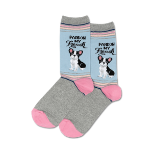 Pardon My French Crew Socks: Womens Crew Socks got a basic makeover! All the joy of owning a French Bulldog without the mess or veterinary bills.Pardon My French socks are adorned with a cute little French Bulldog who clearly has just told a racy joke. Perfect for fans of dogs or punny novelty sock lovers. If you're looking for a way to add some fun to your everyday wardrobe, these Pardon My French socks are the perfect choice.
