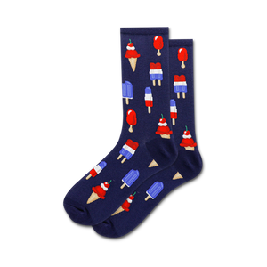 Show your patriotism in a sweet way with these Patriotic Ice Cream socks! These fun and festive socks feature a delightful pattern of ice cream cones and popsicles in red, white, and blue. Perfect for a summer cookout, a 4th of July party, or just a day when you want to feel extra American. So go ahead, indulge your sweet tooth and your love for your country with a pair of Patriotic Ice Cream socks!