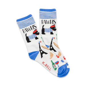 These Pawris crew socks for women are "pawsitively" adorable! Featuring a pattern of black Scottie dogs wearing red berets along with iconic Parisian imagery, these fun socks are perfect for the Francophile in your life. The word "PAWRIS" is playfully knitted into the design, adding a touch of whimsy. Get your pair today and let the fashion "pawsitivity" begin!