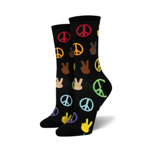 Show off your love for peace and unity with these fun and funky black crew socks, featuring a vibrant pattern of multi-colored peace signs and hands making the peace sign in various skin tones. These socks are perfect for spreading positive vibes wherever you go. They also come in a variety of sizes to fit your feet perfectly. Be a walking billboard for living in harmony and having good times, one step at a time!
