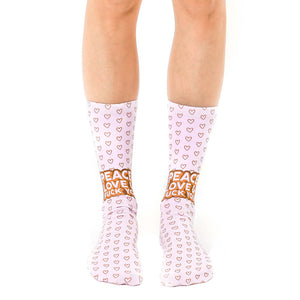 Peace, Love, and a dash of sass? Yep, our socks got it all! Let your feet do the talking with these pink and brown heart pattern socks, boldly displaying "Peace Love Fuck You". Perfect for those who love to add an unexpected twist to their style. These socks are gender-neutral, and come in a comfy crew length. Rock these socks the next time you need a reminder to stay true to yourself and spread good vibes, even when you're feeling a little feisty.