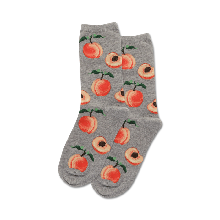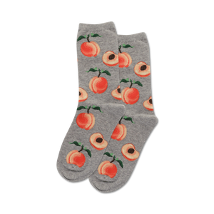 Get ready to put a fresh spin on your sock game with our Peaches socks! These crew-length socks are designed to make you feel juicy and sweet. Featuring a vibrant pattern of juicy peaches on a soft gray background, these socks are sure to put a smile on your face and add a pop of fun to your everyday style. They'll have you feeling and looking peachy keen all day long!