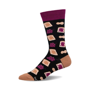 Peanut butter and jelly: the ultimate duo that has graced lunchboxes and late-night snacks for decades. Now, this legendary combination gets a stylish twist with our vibrant sock design. Featuring a medley of peanut butter and jelly sandwiches, peanuts, and grapes, these socks are a visual treat for your feet. With a playful purple cuff and a touch of tan at the toe and heel, they add a delightful splash of nostalgia to any outfit. Perfect for those who appreciate a classic partnership, these socks are a tribute to lifes sweetest combinations.