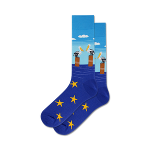 Pelicans on Posts Socks: Make a splash with these vibrant crew socks featuring a school of pelicans perched atop sturdy posts amidst a rough sea. These blue socks are a lighthearted reminder that even in the roughest of waters, pelicans can find their footing. Like you, they're sure to stand tall and fly high no matter the obstacles in your way. Soar into style with these fun pelican socks!