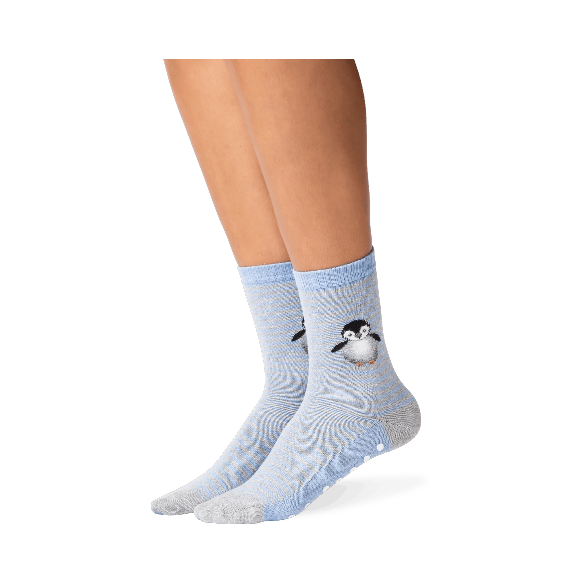 Get ready to waddle in style with our Penguin Crew Socks! These non-slip socks are perfect for women who love penguins and cozy toes. Featuring a fun pattern of black and white penguins with orange feet and beaks on a blue and gray striped background, these socks will make you feel like you're walking on ice (or maybe just sliding around the house). You can't 'penguin' to get a pair of these adorably quirky socks.