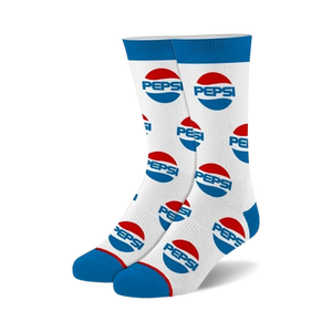 Pepsi All Over crew socks: The coolest way to show your appreciation for that delightful brown bubbly sugar water. If crisp and refreshing blue, white and red are your thing, then these Pepsi logo patterned, unisex crew socks are perfect for you! Wear these and get thirsty for the softest, coolest, and most comfortable Pepsi you'll ever experience. The soda not included.