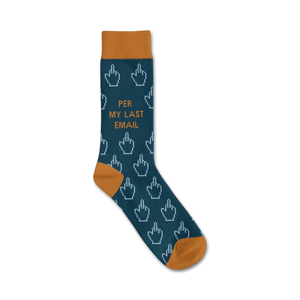 Socks that will make you flip! These crew-length socks for men feature a pattern of middle fingers in various shades of blue on a dark blue background. At the top, you'll find the words "Per My Last Email" in bright orange, poking fun at all those office emails. So next time you're tempted to send a strongly worded message, reach for these socks instead. Who knows, they might just help you keep your cool.