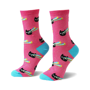 Photon blast off with Pawesome Pew Pew Socks! These pink socks are crackling with energy as each black cat leaps into action, their 3D glasses brightening their stellar performance. Equipped with rainbow laser eyes, these feline warriors will charm you with their high-voltage charisma. Slip into a pair of these crew-length wonders and let your feet moonlight as the next cosmic catwalk.