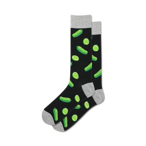 Embrace a pickle-icious adventure with our "Pickles" socks! These foot coverings are sure to tickle your funny bone with their bright green pickle pattern on a black background. Like a pickle in a jar, these socks will keep your feet feeling fresh and crisp all day long. The bumpy texture adds a fun and playful touch to these already zesty socks. Slip into a pair of "Pickles" socks and let the compliments flow like pickle juice!