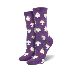 Behold, the Piece of Cake Bamboo Crew Socks! It's like wearing a sweet treat on your feet! Picture this: a scrumptious feast of cartoon cakes on white cake stands, all over a vibrant purple background. Just like a slice of cake brightens your day, these socks' playful pattern will add a dash of cheer to your step, reminding you that life's a piece of cake. Throw on a pair and let the good times roll!
