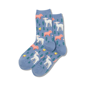 Cuddle up with these crew length Piglet Lamb and Chick socks for women and let your feet indulge in a farmyard extravaganza! Featuring a playful pattern of rosy pink pigs, woolly white lambs, and cheerful yellow chicks adorned with verdant wreaths, these socks are a delightful twist on classic animal motifs.