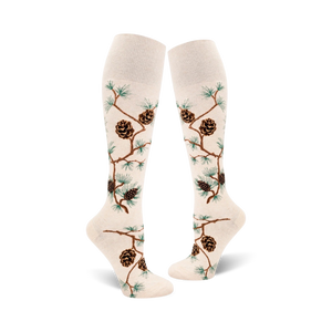These Pinecone Knee High socks for women are off-white and feature a delightful pattern of brown pine cones and green pine needles on a branch. With their fun and woodsy design, they'll add a touch of the great outdoors to your everyday style. Whether you're hitting the trails or just lounging around the house, these socks will keep your feet comfortable and stylish. Plus, they make a great gift for any nature lover!