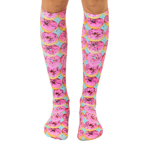 Donut like boring socks? Then get ready to glaze your eyes on our sweet Pink Donuts Knee High Socks! They're the perfect way to add a sprinkle of fun to your feet. Picture this: fluffy pink donuts with colorful sprinkles dancing merrily across a blue backdrop. Putting on these socks is like taking a delightful bite out of a donut - minus the calories! So, treat your toes and elevate your sock game with our Pink Donuts Knee High Socks for both men and women.
