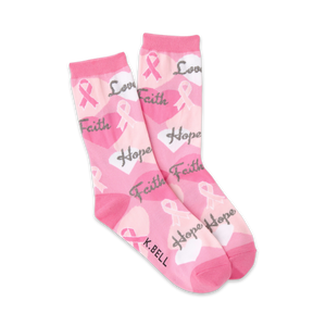 Spread the love, hope, and faith. Show your support for the strong women and men who have had to face breast cancer. Each pair of pink socks features a pattern of floating hearts and Breast Cancer Awareness ribbons. The words "Love", "Faith", and "Hope" among the hearts.
