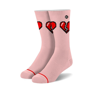 Life can be ruff, but these Pixel Heartbreak crew socks will have you walking on sunshine! With a pattern of 8-bit red pixelated broken hearts on a bold pink background, these socks are sure to make you feel like you're playing a classic video game. Plus, they're made for both men and women, so you can share the love. Remember, love isn't a game, but these socks sure are!