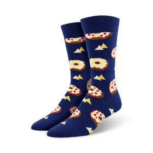 Pizza Bagel socks: One bite and they're your new favorite! These groovy blue socks feature an all-over pizza print. The photorealistic design will have everyone looking at your feet. Don't blame us if people start to crave some pizza cuz these socks are saucy!
