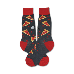 Brace yourself for the cheesiest, sauciest socks around! Our Pizza Slice Crew Socks are a dough-lightful blend of style and comfort, with a red sauce and yellow cheese pattern dancing across gray slices. Green pepperonis add a touch of veggie fun, while a red toe and cuff bring it all together. So slice, slice baby, and add some pizzazz to your feet!