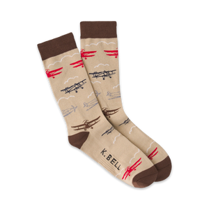 Take flight thousands of feet up in the air and own sky. These cool brown and beige crew socks feature a pattern of different colored classic planes flying high in the sky with simple white clouds. They will take your unique sock drawer and your style to new heights!
