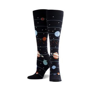 Buckle up for a cosmic adventure with these stellar knee-high socks! Featuring the Earth, Mars, Saturn, and Jupiter in vivid shades of blue and black, these socks will have you soaring through the galaxies in style. Whether you're a space enthusiast, a casual astronomer, or just someone who loves funky socks, these Planets socks will transport you to new worlds with every step.