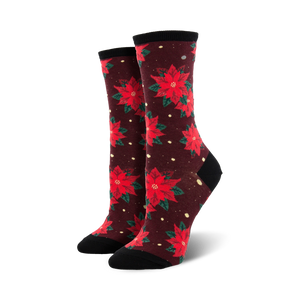 Poinsettia socks! The perfect holiday accessory. These dark red socks are adorned with a festive pattern of red and green poinsettias with bright yellow centers. Plus, they're sure to bring you good luck - poinsettias symbolize good cheer and success. Who needs mistletoe when you can have mistletoes? ;)