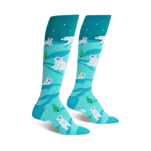 Put on your Polar Bear Stare Knee High socks! With cute white polar bears flaunting their fashionable furs amongst the cool blue evergreen trees and delicate snowflakes, there's no denying the arctic vibes you'll be serving. Be the envy of the animal kingdom as you strut your stuff all winter long. These polar bear socks aren't just cute, they're like a warm, fuzzy hug for your feet.