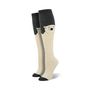 Brace yourself for those cold nights with a cute companion wrapped around your toes! These cute socks are un-bear-ably adorable. We know bear puns can be a bit polar-rizing. Each fun, gray and off-white knee high sock features a solid color blending into a polar bear up the calf.