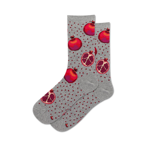 Spice up your everyday life with our Pomegranate Crew Socks! These gray socks feature a cheerful pattern of vibrant red pomegranates adorned with yellow seeds, adding a pop of color to your steps. They're a quirky and fun accessory that will keep your feet cozy and stylish.