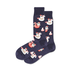 Calling all jolly and magical-loving people! Prepare to dive into the pool of holiday cheer with our Pool Float Santa socks. These dark blue crew socks are adorned with a charming pattern of Santas and unicorns, all decked out with sunglasses, floating on inflatable tubes. Picture this, Santa Claus and a unicorn, chilling and having a blast floating in a pool. Isn't that pure bliss? These socks will add a splash of fun to your festive wardrobe and will surely spark conversations wherever you go. Rock them at your next holiday party or family gathering and spread the Christmas spirit in the most stylish way!