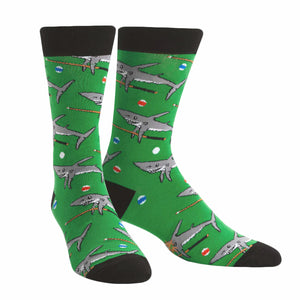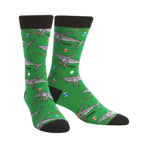 These 'Pool Shark' socks are a fun twist on a classic game. They're bright green- a pool table green- with a repeating pattern of sharks hanging out on pool cues above billiard balls. The sharks are gray and have a slightly goofy expression. The socks shown have black toes and cuffs. They're crew socks- the length is visible in the image. Get ready for some seriously fun feet.