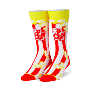 Get ready to pop with excitement with our Popcorn Bucket socks! These crew-length socks are red and white striped with yellow tops, featuring white popcorn kernels all over and bold red text that screams "POP CORN" in a retro font. Perfect for men and women, these socks are sure to add a fun and playful touch to your everyday style. Pop on a pair and let the popcorn party begin!