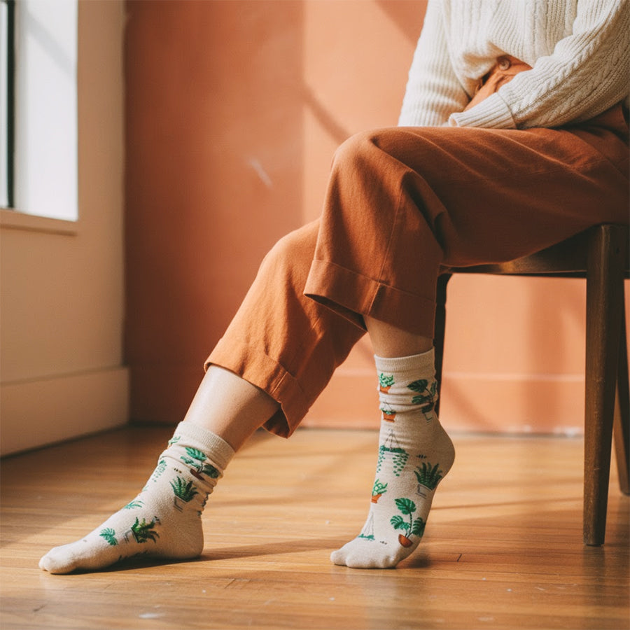 Wiggle your toes in some POTENT-ially cool socks! Dig into those planting pots and unveil a world of floral beauty. The bees knees of hosiery, these clever crew socks for women bloom with potted plant patterns, sure to add a dash of greenery to your step. And just like plants bring life to a room, these socks will surely breathe life into your footwear collection. Grab a pair, channel your inner green thumb, and let your toes bask in the glory of nature's finest!