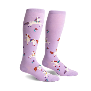 Put on these light purple knee-high socks and let your feet do some fantastical footwork. They feature a playful design of white horses with vibrant manes and tails in shades of purple, gold, and red. Each horse is shown mid-gallop, some wearing small, colorful saddles or blankets in teal and pink. Dotted around the prancing horses are little red flowers with green stems and purple blossoms, adding to the whimsical scene. It's a dreamy pattern that brings a lively, imaginative feel to your everyday.