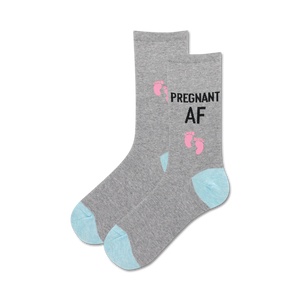 Get a good chuckle in these maternity socks that'll have you laughing through those pregnancy pains. They're gray with blue toes and heels, with the words Pregnant AF in pink lettering, complete with tiny baby feet. Put your feet up in these comfy crew-length socks and show off your growing bump. They're a fun way to celebrate your pregnancy journey and make you smile every time you look down at your feet.