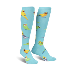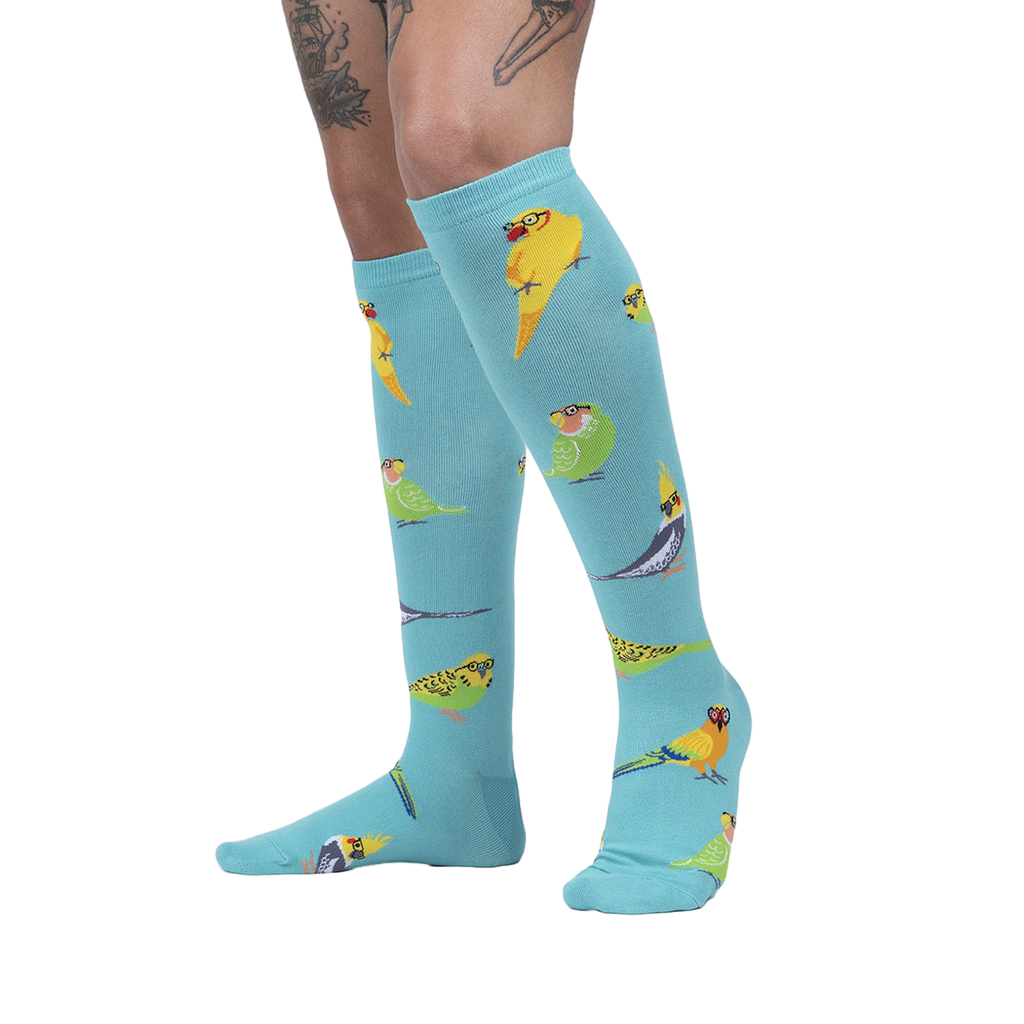 Flaunt your inner nerd with these Pretty Birds knee-high socks, boasting a pattern of witty cartoon birds sporting horn-rimmed glasses. Brighten up your day with the cheerful hues of green, yellow, and orange adorning these feathery friends. These socks are exclusively designed for the stylish women looking to add a touch of whimsy to their wardrobe.