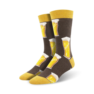 Ready to get foam-tastic? These Prost! beer mug socks are the perfect way to show your love for a cold one. With their brown background and bright yellow tops, these crew socks will have you feeling like you're sitting at your favorite bar, even if you're just at the office. And because they're made for men, you can be sure they'll fit just right. So grab a pair of these beer-utiful socks and get ready to raise a glass to your good taste in fashion!