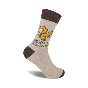 Protect your nuts with these beige-colored crew socks featuring an embroidered brown squirrel holding a nut on the left sock and the brown text "Protect Your Nuts" on both socks. The funny, light-hearted design is sure to bring a smile to your face and a chuckle to those around you. These men's socks are made of high-quality cotton and have reinforced toe and heel for extra durability. They're perfect for everyday wear or as a fun gift for a squirrel lover.