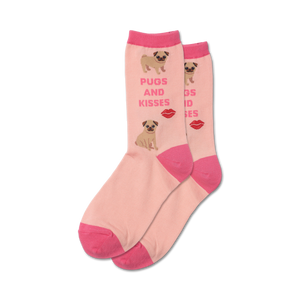 These Pug 'N' Kisses socks are the paw-fect way to add some fun and personality to your wardrobe. With its cute cartoon pugs wearing lipstick and sporting red heart noses, these pink crew socks will add a pop of color and a smile to your day. Made for women who love pugs and kisses, these socks are a great conversation starter and will surely turn heads wherever you go.