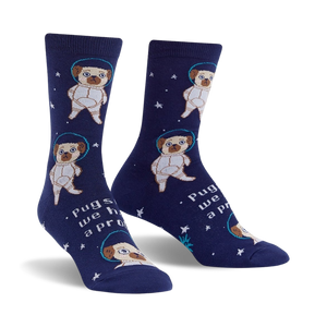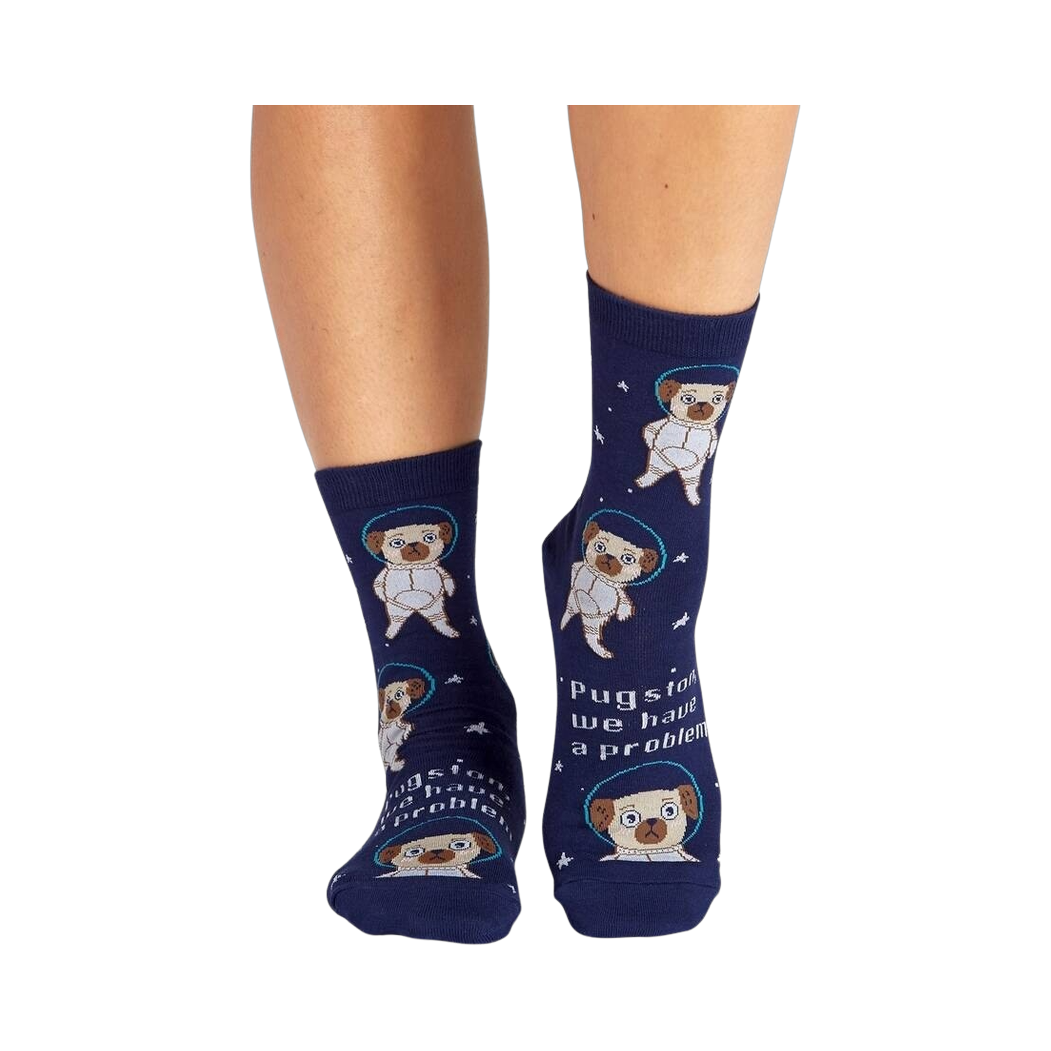 Blast off into a cosmic journey with our Pugston, We Have A Problem socks! Featuring a crew of cartoon pugs suited up in space gear, these socks are out of this world! Get ready to explore the great unknown with these fun and fashionable socks that'll make you smile every time you put them on.