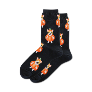 Prepare to get paw-some! Strut your stuff this Halloween in our Pumpkin Corgi socks, featuring a mischievous crew of cartoon corgis trick-or-treating in pumpkin costumes. These crew socks for women are a delightful mix of spooky and adorable. The black background makes the vibrant orange pumpkin costumes pop and adds a touch of festive flair to any outfit. So slip into a pair of these delightful corgi socks, grab your candy bucket, and get ready for a howling good time.