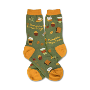 Like a pumpkin spice latte, these Pumpkin Everything socks will add a dash of fall flavor to your feet. The bright orange toe, heel, and cuff will remind you of your favorite pumpkin patch, while the green body of the sock is covered in pumpkins, leaves, and other autumnal imagery. The words "Pumpkin Everything...Everywhere" are proudly proclaimed across the sock, letting the world know that you're all about that pumpkin spice life. And with their crew length, these socks will keep your ankles warm during those brisk fall mornings.