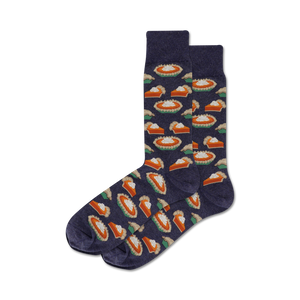 The Pumpkin Pie socks are as delicious as they look! Feast your feet on these Thanksgiving-themed socks, featuring a delightful pattern of cartoon pumpkin pies. Each pie is a perfect bite-sized treat, complete with a brown crust, orange filling, and light brown whipped cream topping. These crew-length socks, made for men, are sure to make your feet smile.