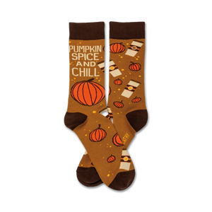 Spice up your sock drawer with these scrumptious Pumpkin Spice and Chill socks. Featuring a delightful pattern of autumnal pumpkins and inviting take-away coffee cups, with the words 'Pumpkin Spice and Chill', these crew socks for women will add a dash of warmth and coziness to your day. They're sure to make your toes do a little dance!