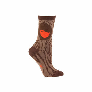 It might be cold on the outside, but we can safely assure you - it's warm on the inside of where this cute little bird resides. These cool, rustic socks feature an orange bird resting on a brown wrap around tree trunk. Get back in touch with nature!