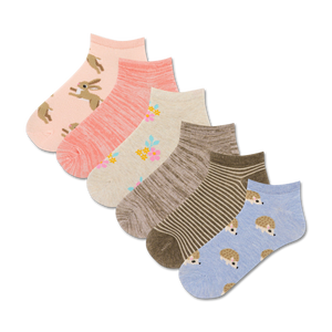 Who says you can't dress up your feet while being as cozy as a bunny in a burrow? Meet Rabbits and Hedgehogs 6 Pack, a bundle of ankle socks that are equal parts fuzzy, charming, and durable. Each pair of socks proudly features playful patterns of pink rabbits and brown hedgehogs frolicking among blooming flowers, bringing whimsy and cheer to your everyday adventures. Slip into a pair, and before you know it, you'll be bouncing through your day like a carefree bunny and hugging every hedgehog in sight (don't worry, they love it). Ideal for the women who love a touch of enchantment in their wardrobe, these womens socks are here to bring a spring in your step and a smile to your face.