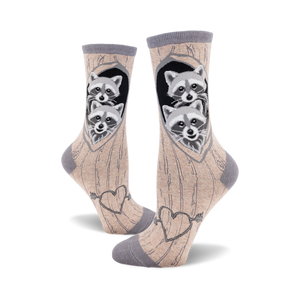 Raccoons, with their clever antics and adorable masked faces, have long been the unofficial mascots of curiosity and mischief. These crew socks celebrate that charm, featuring happy raccoon faces peeking from their cozy tree trunk den. The intricate tree bark design adds a touch of woodland whimsy, while the carved heart on the foot serves as a playful nod to your unwavering love for these little trash pandas.
